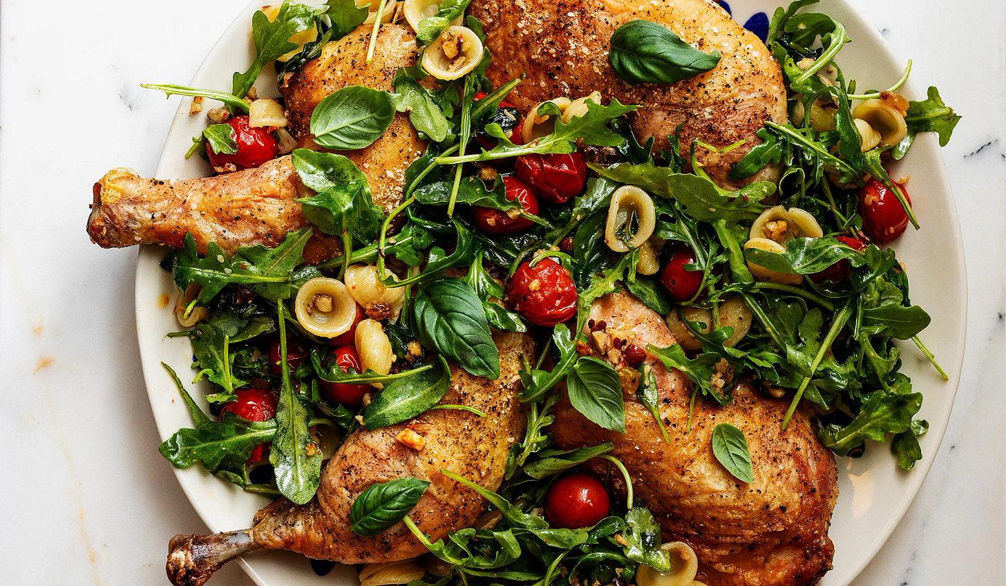 An arugula pasta salad filled with hazelnuts, golden raisins, burst cherry tomatoes, and just the right amount of Calabrian chili oil works so well with juicy roast chicken for a dinner you’ll want on repeat.