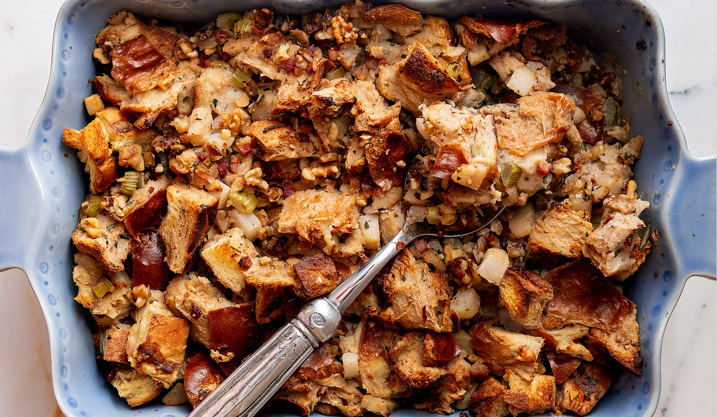 A rich pear-pancetta stuffing is the sweet, salty, ultra-savory side that pairs perfectly with roasted turkey or chicken.