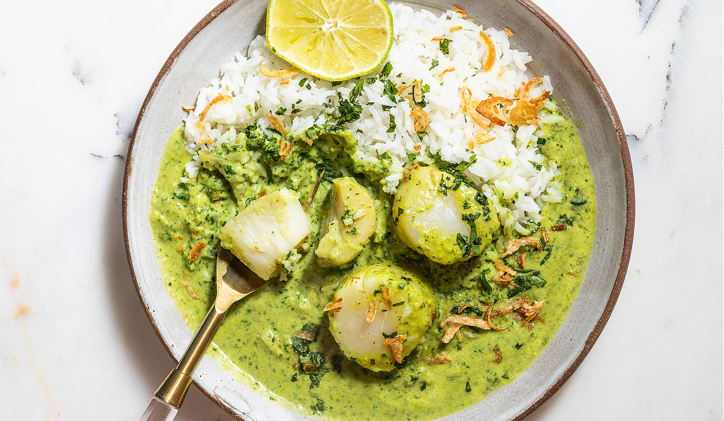 This is actually an update to a very old recipe on my site, so we’re going to pretend it’s new! Sweet, tender sea scallops work beautifully in this spicy, fragrant, creamy green curry for an easy, flavorful dinner recipe.