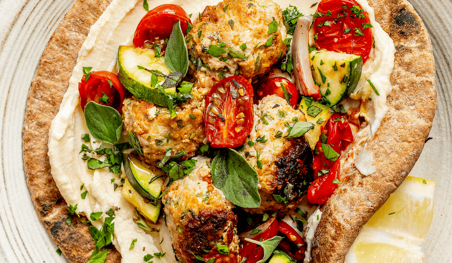 Juicy, fragrant chicken meatballs taste even better on a warm pita with plenty of hummus. Paired with summer vegetables, it’s a dinner you’ll want on repeat.
