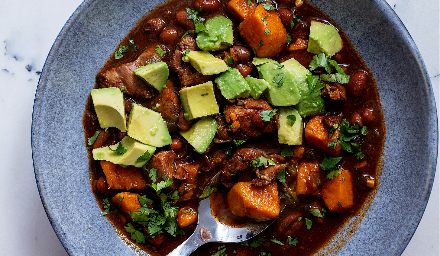 This spicy soup is a weeknight dream: loaded with tender chicken thighs, sweet and earthy sweet potatoes, and hearty pinto beans, it’s a recipe you’ll want through all the chilly months.