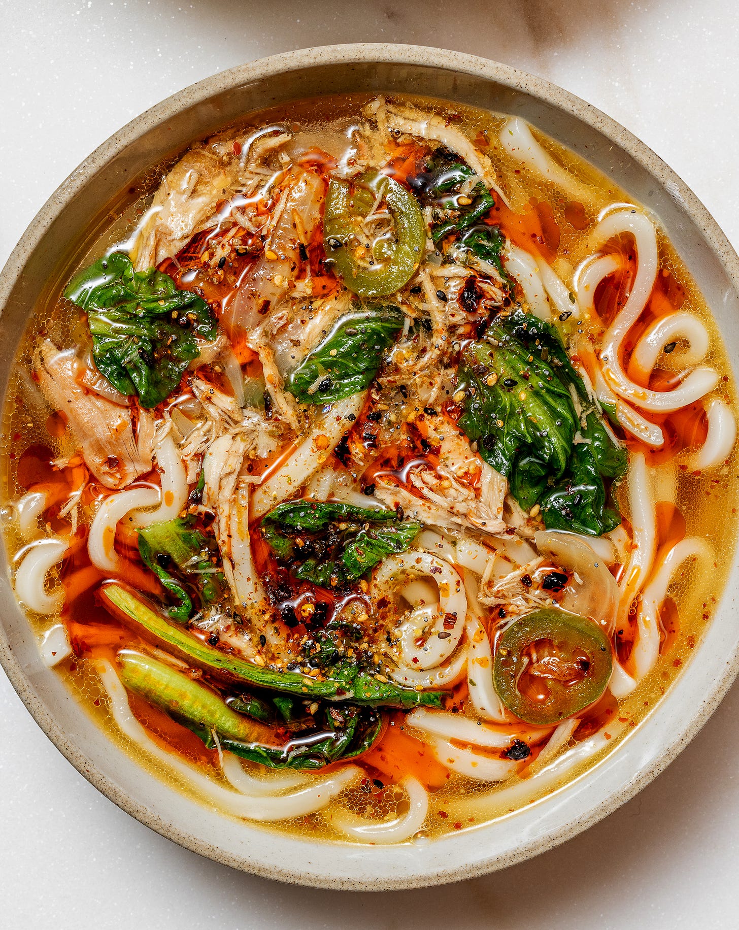 Wipe out the pot and heat a little oil over medium. Add a sliced onion and cook for 5 minutes. Add a big pinch of shichimi togarashi and the shredded chicken. Pour in the stock and bring it to a boil. Add 1–2 teaspoons of dashi powder, if you like, and 2 sliced jalapeños. Reduce heat and simmer for 20 minutes. Add greens, like tatsoi, spinach, or bok choy, and cook until bright green. Finish with a drizzle of sesame oil and a splash of mirin. Taste and season.