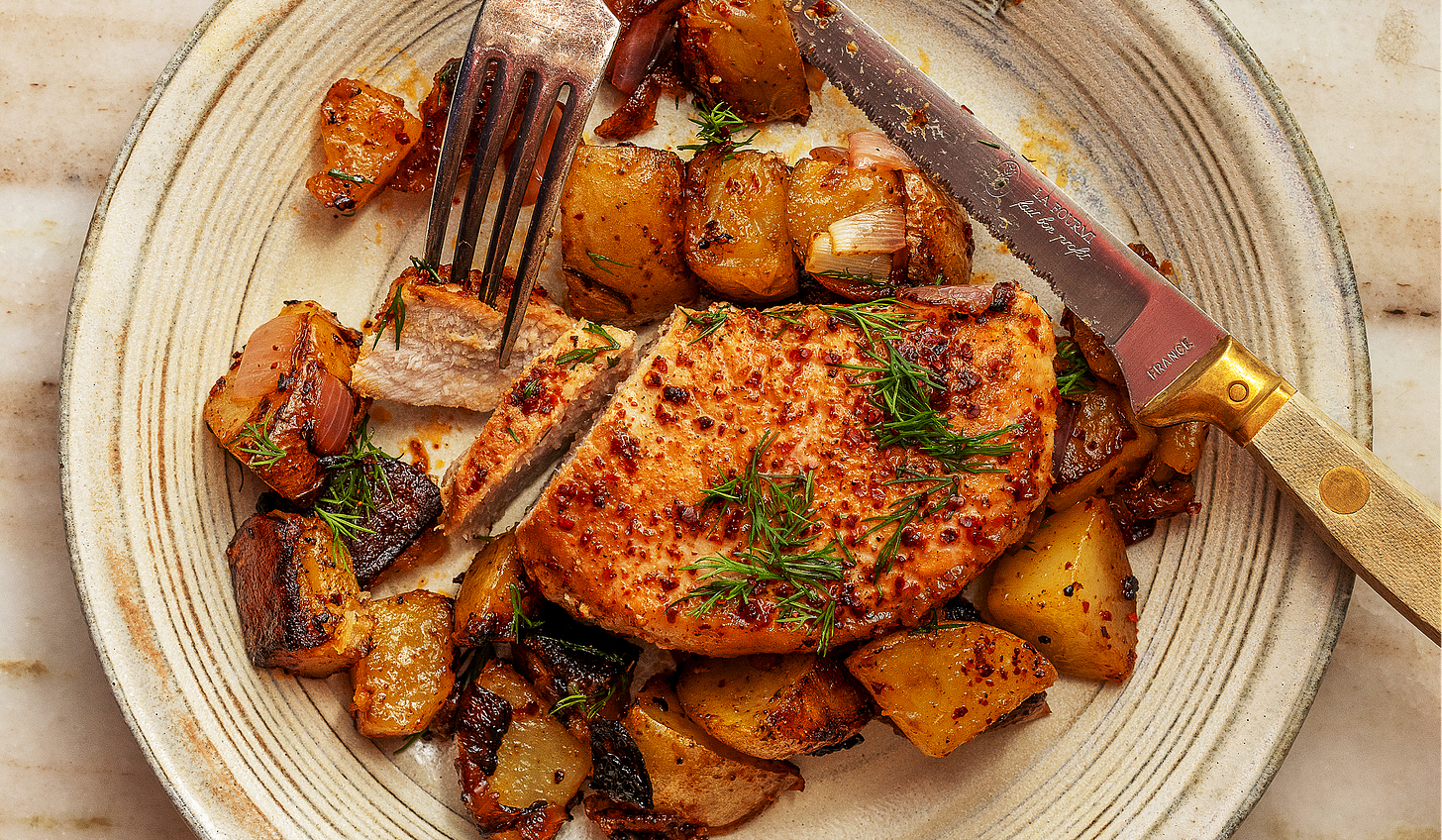 Some nights call for a dinner that involves chucking everything into a skillet, hurling it into the oven, and calling it a day. This easy pork chop dinner is the kind of no-fuss recipe we all need in our lives. Low effort, big flavor, what’s not to love?