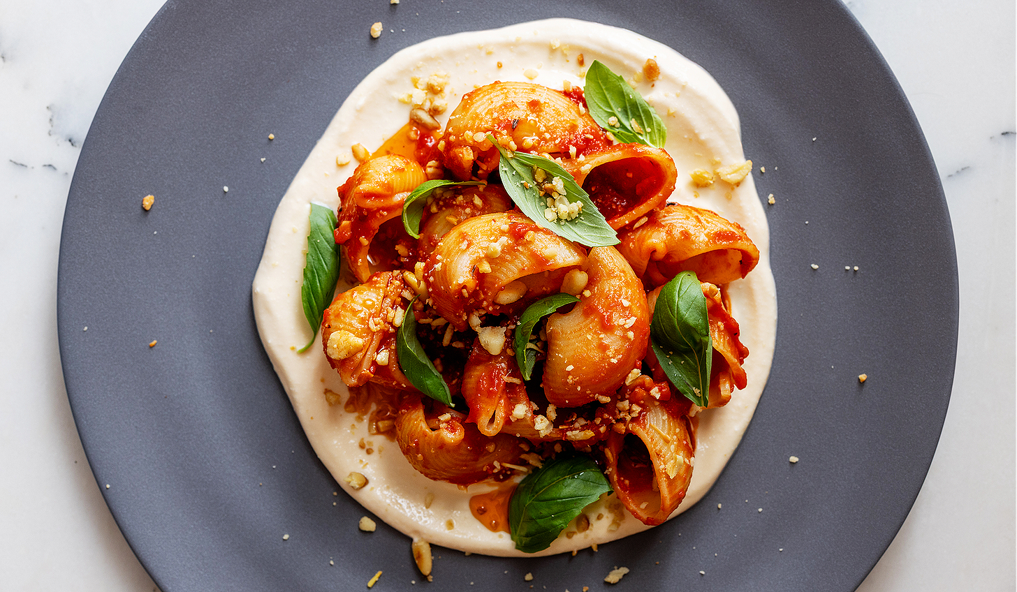 Saucy pasta is piled on top of rich, sweet, spicy Calabrian hot honey whipped ricotta and finished with toasted, crushed pine nuts for a deliciously decadent dinner.