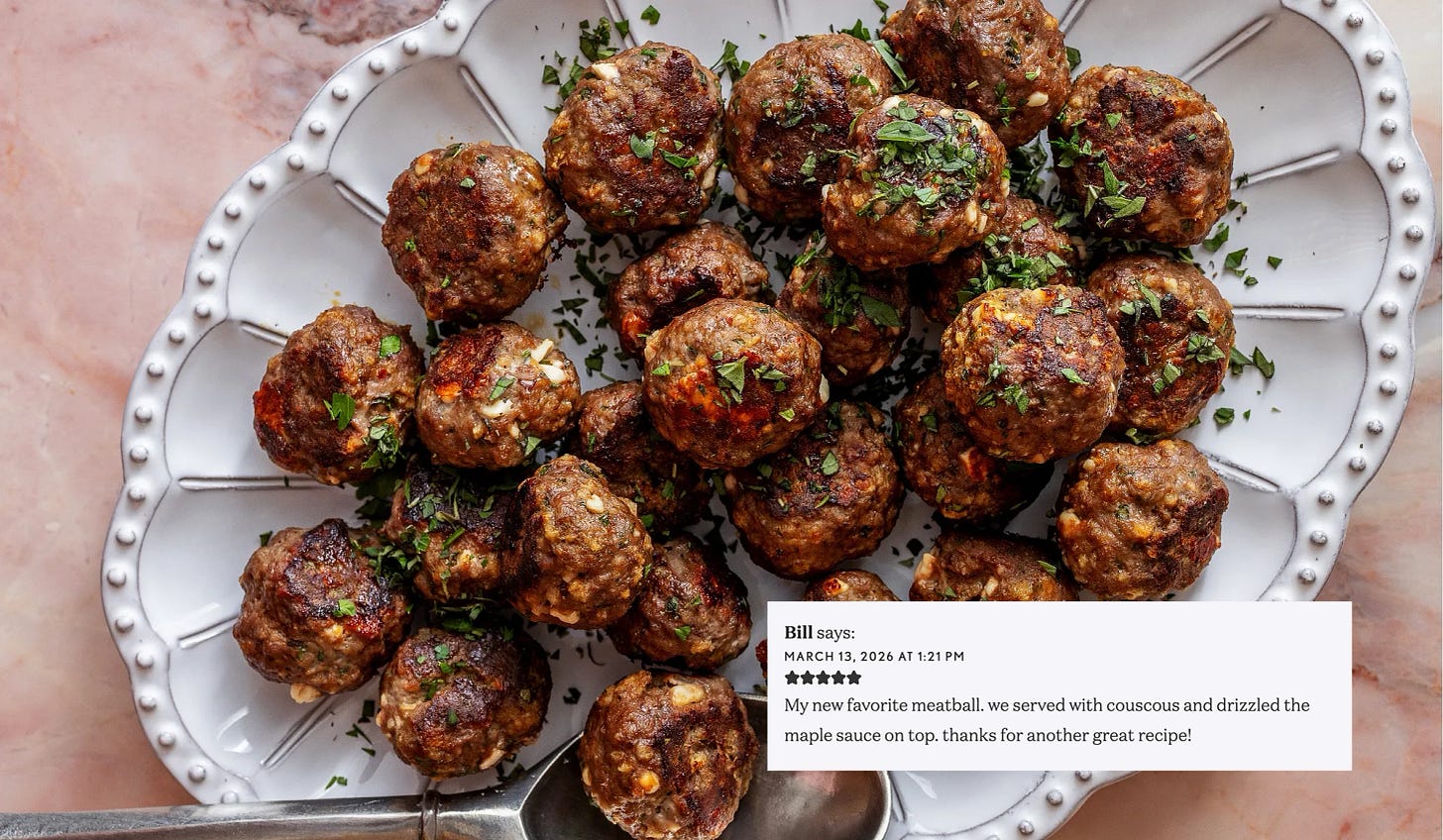 Thank you, Bill! Serving these meatballs on couscous is such a great idea! The perfect vehicle for that sweet and spicy harissa-maple sauce. Delish!