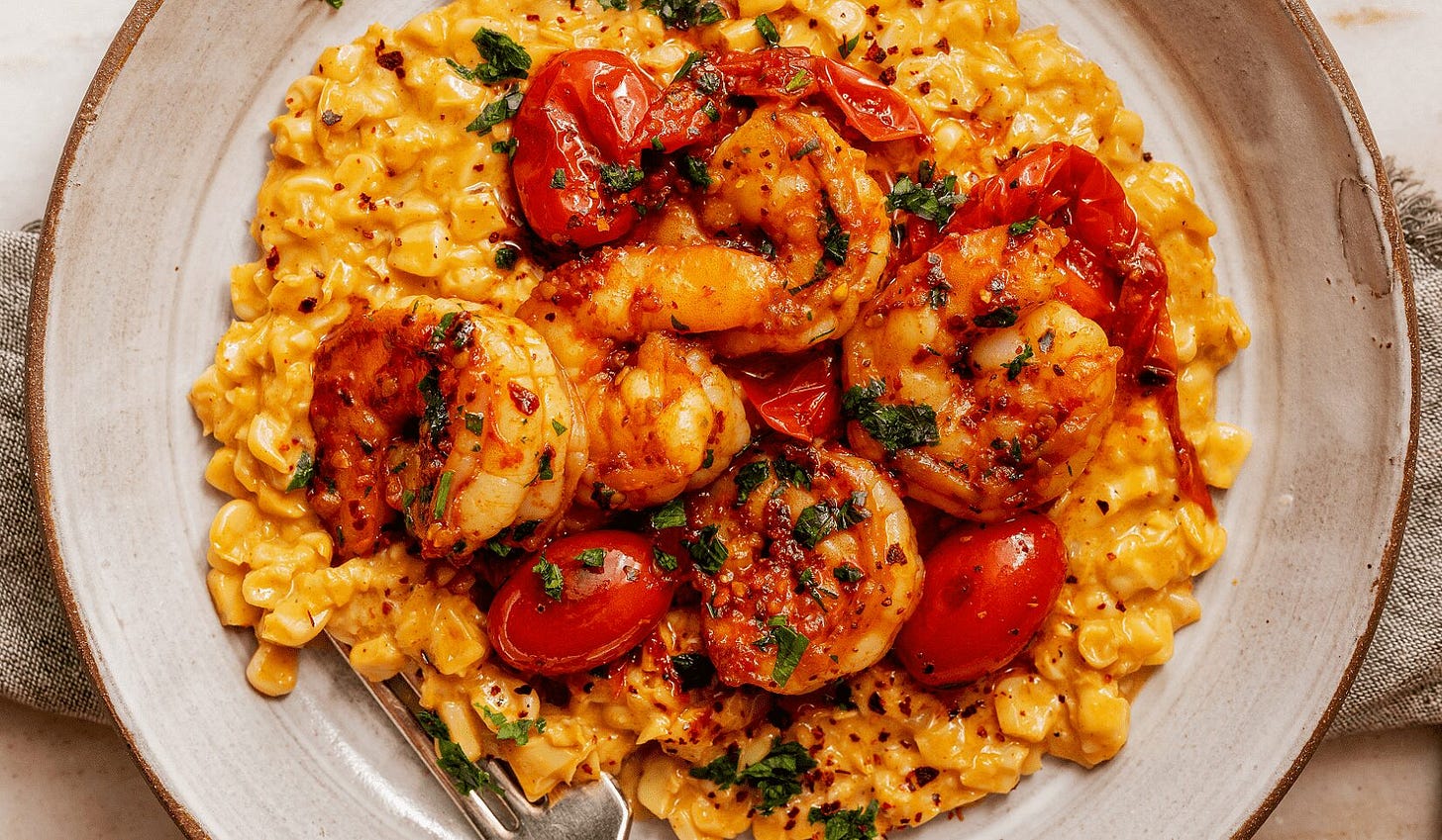 Aleppo Pepper Shrimp with Creamed Corn