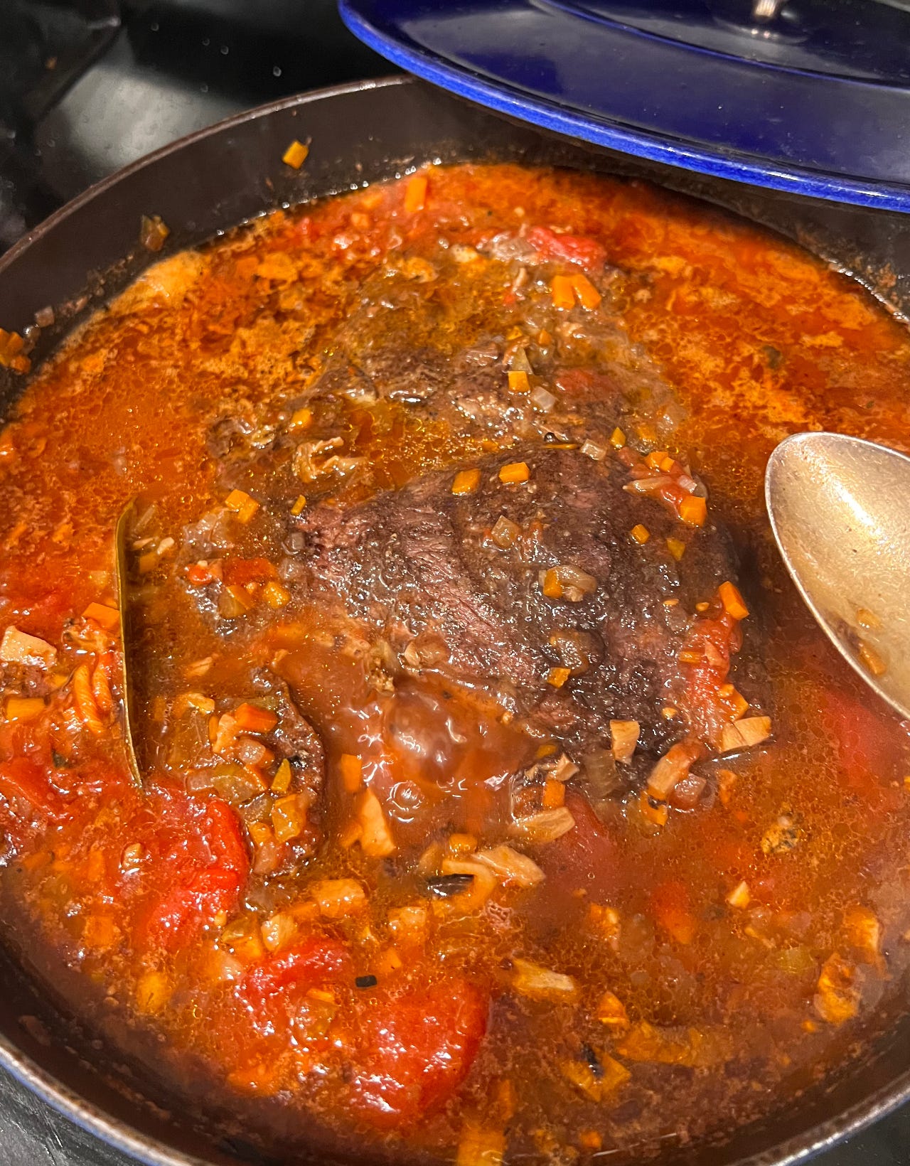 I am going to be a bit sacrilegious and shred half of the roast for pasta. For the other half, I am going to slice it thinly and pile it on a toasted hoagie roll with the sauce slathered on the meat and then melt mozzarella cheese on top. I told Stefano my plan, and he sent two laughing emojis which made me feel like this perhaps pained his heart. I don’t know, but I think it’ll be delicious.