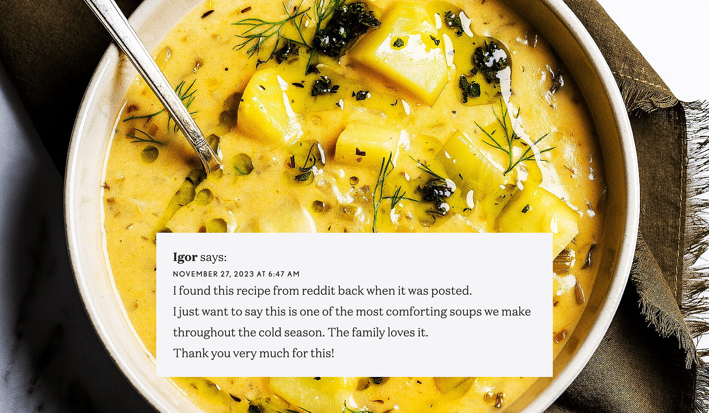 Readers are definitely deep into soup season on the site, and this recipe for potato-leek soup is one of my most popular. You’ll love the fragrant sage oil that you drizzle on top of this bowl of pure comfort.