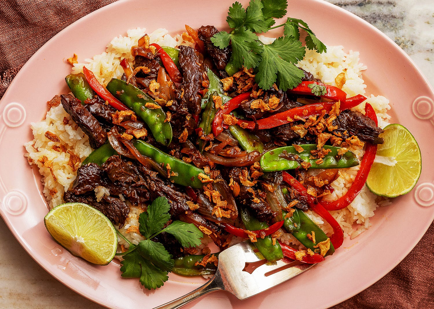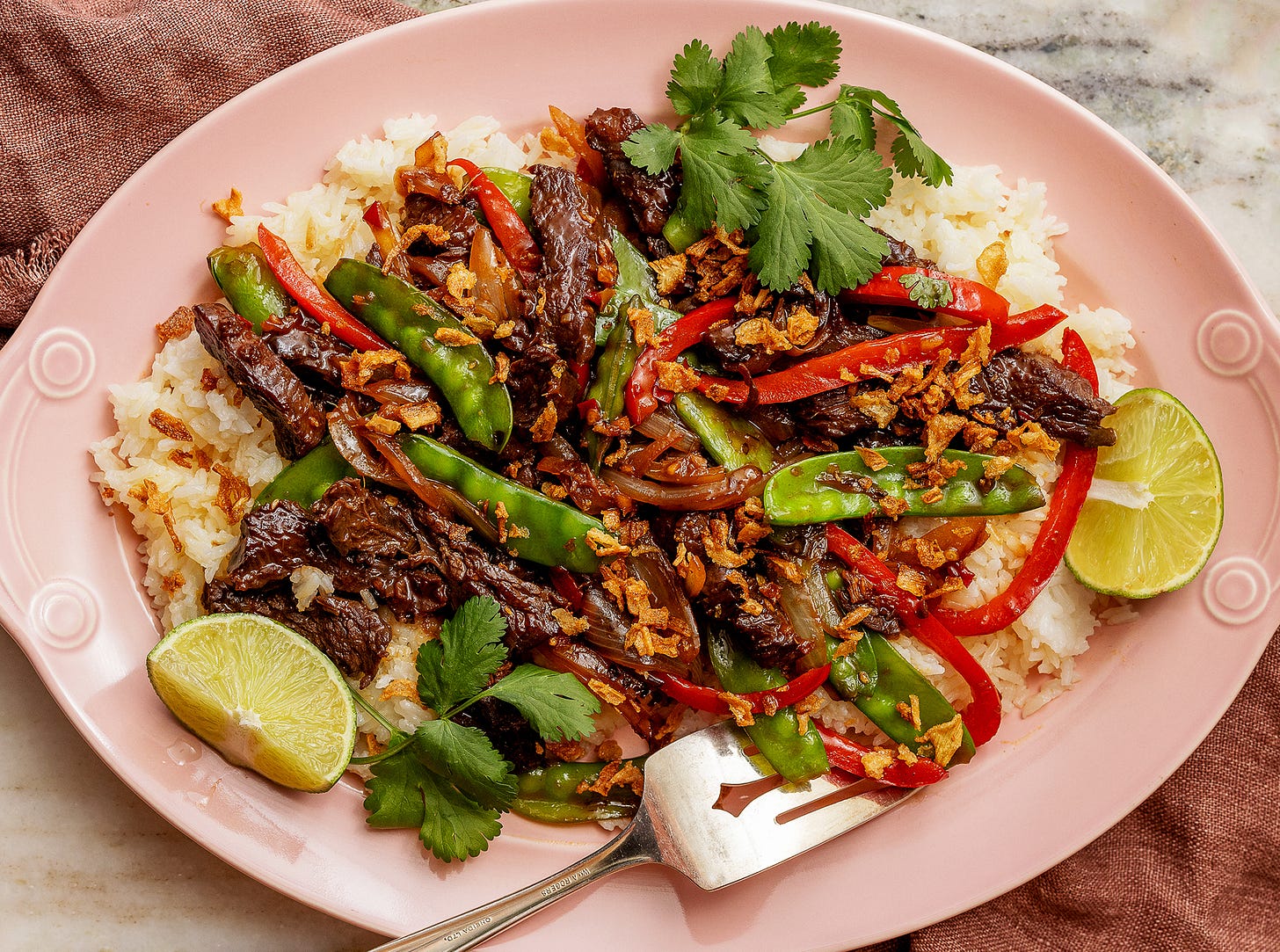 Arrange the cooked white rice on a serving platter and pile the stir-fried beef and vegetables on top. Garnish with cilantro, scallions, lime wedges, and crispy shallots. Enjoy!