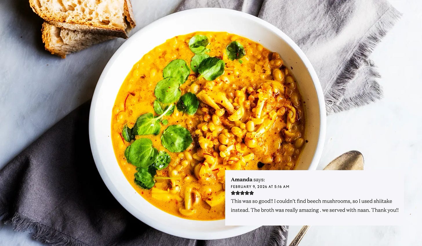 Thank you, Amanda! Shiitake mushrooms are an excellent substitute for beech mushrooms. So thrilled you love that rich, golden saffron broth.