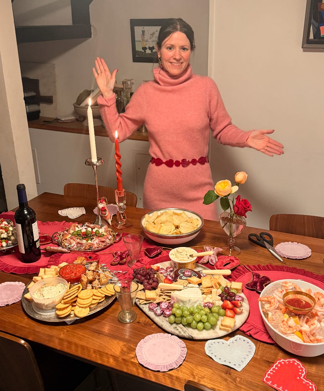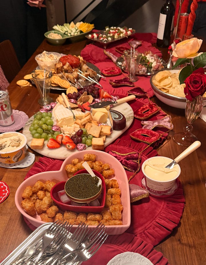 My theme was āCutie Piesā, so I made a vegetarian pot pie and a chicken pot pie. For snacky appetizers, I made cheese and olive skewers, and I also made a really good Calabrian tomato dip with big toasted butter-and-herb Parmesan croutons for dipping (it was DIVINE). I also made shrimp cocktail (which Iāve been obsessed with), and I took a chance and ordered caviar from Quince. The price was suspiciously low compared to other places, but Iāve never bought caviar before, so I didnāt want to go overboard. It was actually really good! I served it with extra crispy tater tots and crĆØme fraĆ®che. I also made my Cherry Garcia Upside-Down Cake and raspberry London Fog tiramisu. I think everyone really enjoyed themselves. Galentineās Day is absolutely my favorite holiday of the year, and I really like to splurge to treat all my friends to an amazing meal.