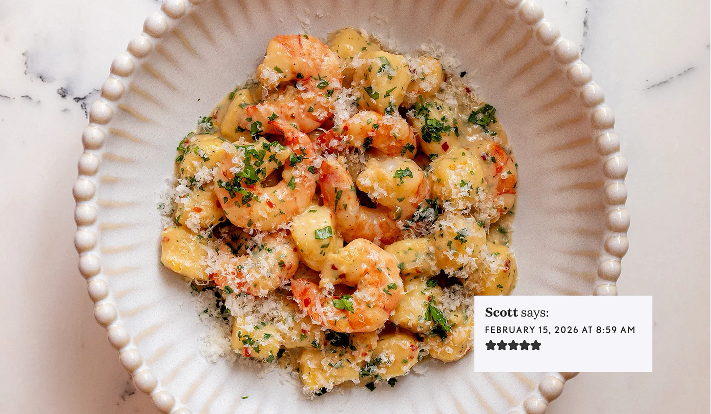 Thank you for rating this recipe, Scott! Tender shrimp and fluffy gnocchi are bathed in an irresistible creamy, rich sauce.