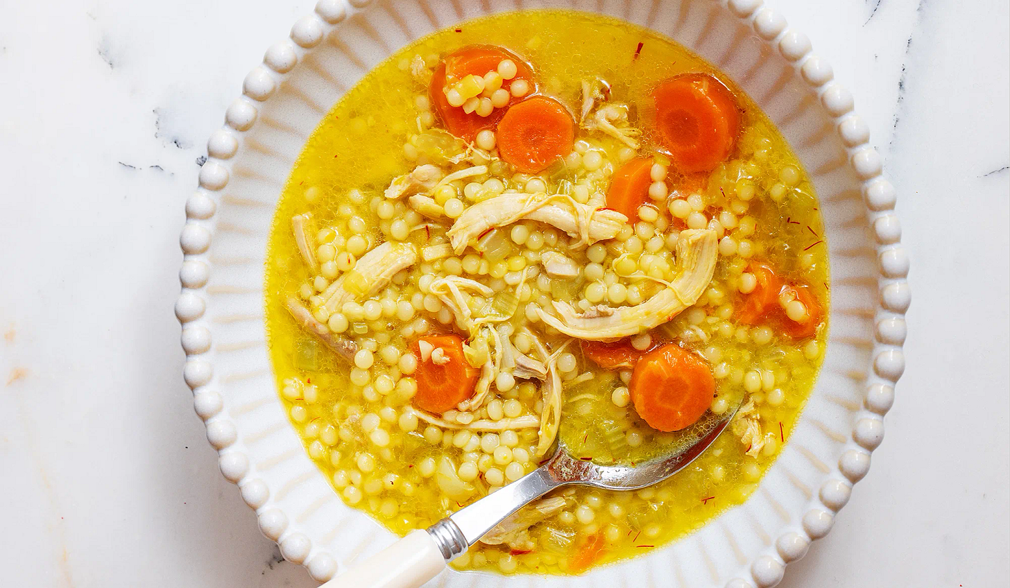 Rich chicken broth with saffron and leeks, this chicken soup is the perfect midweek pick-me-up.