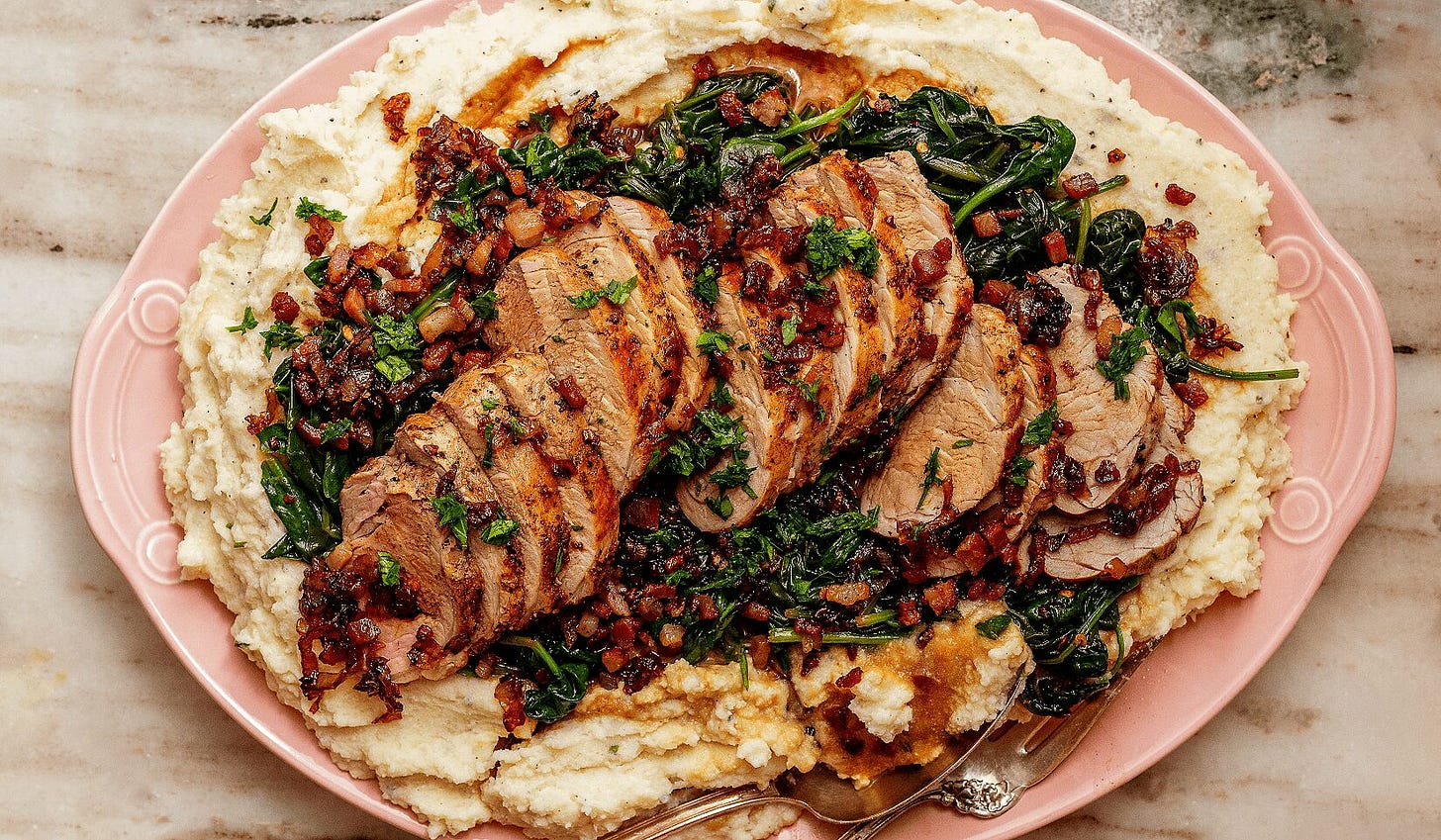 This is my favorite pork tenderloin recipe ever. Served with ricotta mashed potatoes, spinach, and caramelized shallots, it’s a meal that looks stunning and tastes delicious.