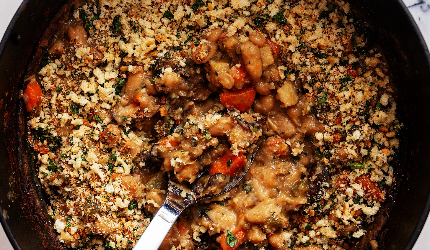 This comforting, savory white bean cassoulet is peak winter comfort. With mushrooms, parsnips, carrots, and a toasted breadcrumb topping, you’ll be craving this on cold nights.