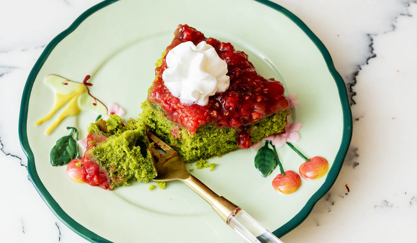 A moist matcha cake with a sweet raspberry topping! This raspberry-matcha upside-down cake is a dessert that will delight everyone you serve it to.